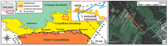 (a) Location of the study area (dashed rectangle) in the Polish Carpathian Foredeep; (b) Osiek sulphur deposit; (c) Location of seismic profile (orange line) and wellbores (red circles; source of map: Google Earth).