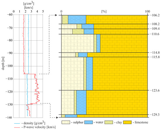 The average P-wave velocity in crystalline sulphur is 2500 m/s [27], while in water it is 1410 m/s. The P-wave velocity for the limestone skeleton can reach up to 6200 m/s [28]. Due to the small presence of clay matter, the reservoir interval can be described by a three-component model (limestone, sulphur and porosity filled with water), in which case the value of the P-wave velocity can be calculated according to Wyllie’s equation [29]: