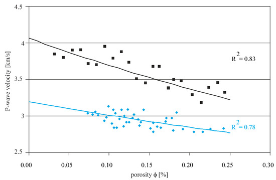 A change in porosity will induce a change in velocity with an accompanying change in sulphur content. The black line in Figure 4 represents the distribution of the P-wave velocity values determined by the estimator for the three-component model and the velocity value in the consolidated limestone skeleton of 6220 m/s. The black dots are the interval velocity values determined from well logging. The very good fit of the model values to the real data is evident. A significant decrease in velocity can be observed with increasing porosity of the reservoir rock (in the range 4000–3300 m/s). As we mentioned earlier, Equation (3) describes well the reservoir properties at low concentrations (several percent) of the clay material and in the porosity range 3–22%. However, as well logging data show, in zones with low sulphur concentration the crystalline and massive limestone changes into marly limestone. The P-wave velocity in the limestone skeleton is then reduced to values of about 4000 m/s, resulting in much lower velocity values in the deposit layer. After correction for the clay content of the limestone skeleton (20%), velocity changes occur in the range 3200–2800 m/s (blue line in Figure 4). This model also agrees with the actual values (blue points).