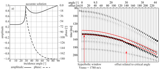 The dependence of the reflected signal amplitude on the angle of incidence is described by the Zoeppritz equations [47]. A significant increase in velocity at the boundary at the top of the sulphur-bearing limestone layer causes the critical angle to be smaller or close to 30° and results in the signal amplitude value to increase rapidly for relatively small offsets. For angles larger than the critical angle the phase of the signal is rotated. A detailed discussion of the quantitative dependence for such a case is presented by Aki and Richards [46]. For a velocity model corresponding to reservoir conditions, i.e., average velocity contrast between overburden and limestone (1780/3600 m/s) and the depth of the interface equal 120 m, the change in signal amplitude and phase are shown in Figure 5a. The Zoeppritz Explorer Applet [48] was used for the calculations and assumed a P-wave and S-wave velocity ratio of 1.8 in both layers, and a bulk density for the overburden and limestone of 2.57 g/cm3 and 2.37 g/cm3, respectively.