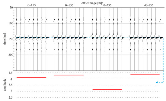 Figure 6 shows the effect of stacking signals within the CMP gather (after NMO correction) for different offset ranges on the amplitude of the wave reflected from the deposit. For stacking, we used the synthetic CMP gather shown in Figure 5b. The result of stacking the synthetic CMP gather shows that in the offset ranges 0–115 m, 0–155 m and 40–155 m the amplitudes had similar values (in the range 4.2–4.4). However, stacking for all offsets (0–235 m) resulted in a clear reduction of the amplitude value to 3.2.