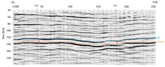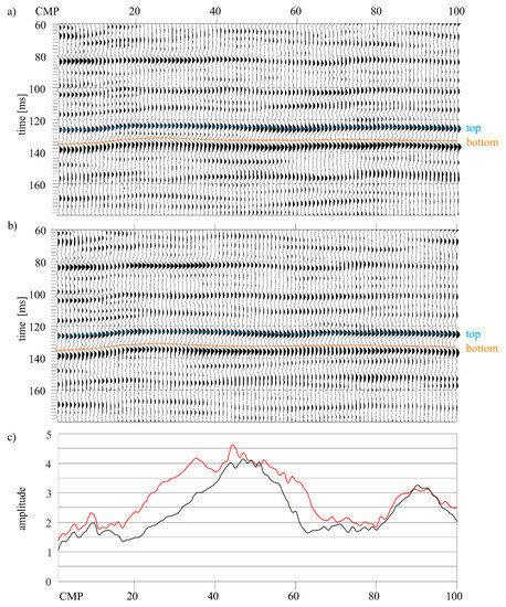 Similarly, to the synthetic data, for the field data we performed stacking for the offset ranges 40–155 m and 40–235 m (Figure 7a,b, respectively). The resulting cross sections were almost identical, differing only in details. However, in the values of amplitude of reflection from the deposit there were clear differences (Figure 7c). Increasing the offset value resulted in a decrease in the amplitude. This was especially true in the CMP 20–60 range, where the interval velocity value was increased in the deposit and the top was slightly elevated. A local increase in velocity caused a decrease in the value of the critical angle, and the decrease in depth decreased the value of the offset corresponding to this angle.