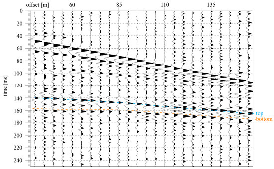 Seismic data were collected using a Geometrics Geode recording system with 100 Hz vertical geophones (receivers) placed 5 m apart. 100 Hz geophones allow higher resolution to be achieved than with commonly used 10–24 Hz geophones because they perform better in the high frequency range and the same time better attenuate unwanted low frequency noise [49]. We used end-on roll-along spread with Gisco ESS-500 Turbo seismic source (accelerated weight drop of 227 kg—impact velocity of 6 m/s with an energy of 4088 J). The shot and receiver interval was 5 m. To obtain high signal to noise ratio at each shot position, typically three weight drops were performed. Then the corresponding records were vertically stacked. In places where the ground was loose then more than three drops were performed. By performing acquisition in the 40–155 m offset range, coherent noises such as surface wave and air wave occur at times greater that the reflections from the top and bottom of the deposit. In such a case, the amplitudes of these waves do not disturb the response from geological target and do not have to be cut out at the processing step. The use of filters to remove such interference usually leads to a distortion of the signal amplitude. The designed geometry allowed us to obtain an average fold of about 12 with a CMP spacing of 2.5 m. Table 1 summarizes the main acquisition parameters used to acquire the data. Figure 8 shows one of the acquired raw shot record. The acquired seismic data have good quality overall, with clear reflections from the top and bottom of the carbonate sulphur deposit.