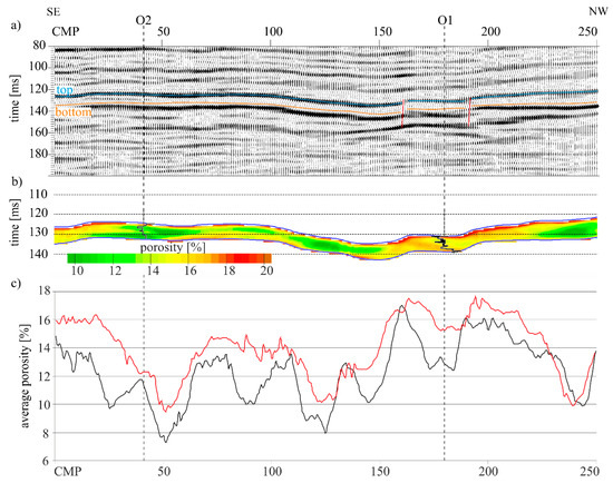 (a) Seismic cross section (see Figure 9 for description); (b) spatial distribution of porosity within the deposit derived from seismic inversion, with porosity logs displayed; (c) diagrams showing calculated porosity: red line—average porosity from seismic inversion, black line—porosity from amplitude of reflection from the top of deposit.
