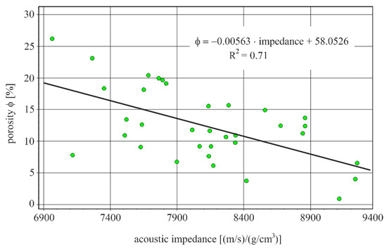 We wanted to compare our method of calculating porosity with the standard procedure that is used for seismic reservoir characterisation—seismic inversion. This method utilizes seismic and borehole data to transform the seismic data from the amplitude domain to the impedance domain, which gives insight into the quantitative petrophysical parameters of the subsurface [52,53]. Seismic inversion was calculated using Hampson-Russell software (version 10). For the calculation of impedance, Post-Stack Model-Based Inversion was used [54]. In this method, a simple model of the subsurface is designed through the interpolation of well log measurements (P-wave velocity and bulk density) along interpreted horizons and then recursively altered until the derived synthetic section best fits the original seismic data. Then using a derived relationship between porosity and acoustic impedance (Figure 12), we transformed the result of the inversion into the spatial distribution of porosity. Figure 11b shows the porosity distribution in the reservoir correlated with borehole data. For the porosity distribution obtained in this way, the value of average porosity within the deposit was calculated for each CMP (Figure 11c—red line).
