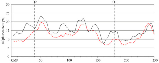 Finally, we calculated the sulphur content for both porosity estimation methods using Equation (1). The percentage of sulphur content determined from seismic inversion is on average a few percent lower than for the method based directly on calculation from the amplitude of the wave reflected from the top of the deposit (Figure 13). Excluding the surroundings of CMP 180, where tectonic disturbances occur, the differences were not large and the general trends were similar.