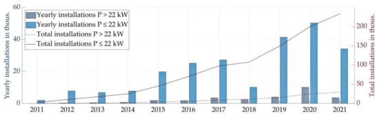 This poses an increasing challenge to the current grid infrastructure as the current building and commercial object where connections have been designed for specific power values with a minimum reserve resulting from the connection plans. In the past, the possibility of increasing the load on the grid as a result of new vehicle charging points had not been considered. This results in some network elements which are now exposed to overloading of the distribution lines. Despite the difficulties of integrating EVs into the grid, their number is steadily increasing. The number of new public charging points have been rising in recent years, as shown in Figure 1 and Figure 2. Figure 1 also forecasts the growth in the number of charging stations in 2021. Figure 2 represents the number of times the vehicle has been charged in the specified energy range in one year. The development of EVs will eventually require the power grid to be adapted to the needs of electromobility.
