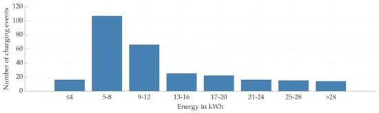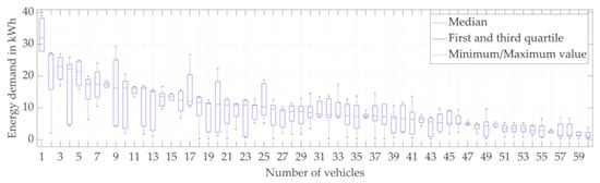 The energy demand for each vehicle is also shown in Figure 11. In this case, the minimum and maximum energy demand can be observed in Figure 11, which were determined based on individual trips for each vehicle separately. The ranges in which electric vehicles were most frequently used were also identified. The average value for the minimum required capacity, calculated based on all the objects tested, was 2.96 kWh. Similarly, the average value for the maximum values was 15.17 kWh. The average median value of all vehicles was 9.86 kWh.