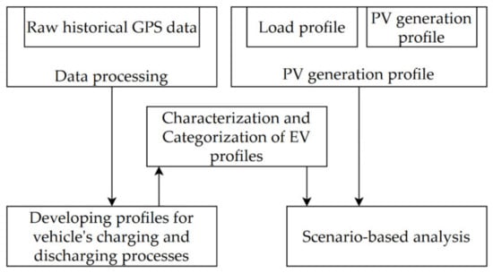 The analyses were carried out using the Matlab R2020a software environment and based on measurement data consisting of n = 604,800 points, which include weekly profiles of the fleet of diesel vehicles specializing in the provision of transport services. The GPS data used from “DAKO-Key” recorders placed in 60 light commercial vehicles (LCV) monitored the route traveled during the day and logging the selected parameters at a 1 min. frequency. The GPS recorders enabled 60 cars to be identified within one week in the process of delivering products in Halle/Saale in the southern part of the region of Saxony-Anhalt, Germany. They were used as input to simulate the use of EVs equipped with a battery pack in the scenarios under consideration. The calculations also used load measurements recorded by Janitza UMG 604-Pro and a power generation profile from the PV farm based on Siemens 7KM PAC4200 in September, 2018. A simplified model of the analysis is presented in Figure 3.