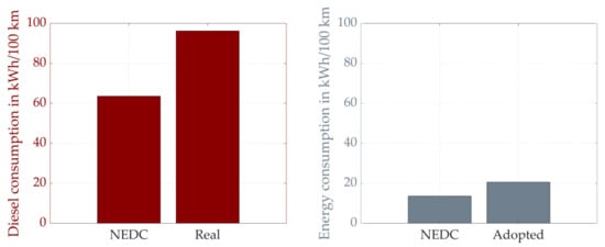 Furthermore, based on the driving profiles calculated and the time during which the vehicle remains in parking place, the electricity consumption profiles during driving and the charging profiles for which the corresponding values in kWh have been adopted. During the vehicle trips, it was not possible to measure the vehicle cargo, so these data were not used to determine the electric energy consumption. This value was determined on the basis of The New European Driving Cycle (NEDC) from which the manufacturer determined the energy consumption of the vehicle. The specific energy consumption for this study was calculated based on real fuel consumption from measurements compared with NEDC standard consumption (Figure 4). In this case, a 51.3% increase in consumption was measured in comparison with the manufacturer’s declaration. The scaling factor was defined, and a further electrical consumption specification was amplified accordingly. The simulation considers the energy consumption declared by the manufacturer of the Nissan e-NV200 [], which is 136 Wh/km (NEDC), and for which the consumption value has been increased to 206 Wh/km by calculated the scaling factor.