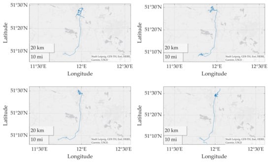 Furthermore, based on GPS data and the assumptions made, the daily energy consumption of the vehicle during the departure has been calculated according to Equation (2). Equation (3) shows the value of the charging power at the possible time intervals selected. Examples of the vehicle routes are presented by GPS data, and they are shown in Figure 5.
