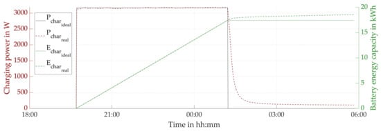 A simplified model was adopted for which the power value changes in steps to create charging profiles for EVs. The simplification adopted does not affect the simulation results obtained significantly, and the average relative error of the supplied energy E determined for the whole recorded charging process from Figure 6 does not exceed σE = 2.19%. Figure 6 was developed on the basis of the same measurements, which were also partly used to analyze harmonics during vehicle charging in article [].