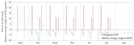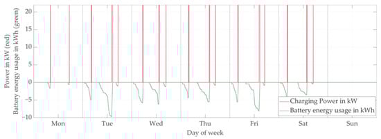 The simplification used in Figure 6 was implemented in a simulation for which the time intervals were determined in which the vehicle battery can be charged using the default 22 kW charger. The charging power is controlled depending on the algorithms applied, which are described in Section 5. Figure 7 shows a selected one-week profile of one EV including the time windows available in which the vehicle has completed its trip and is recharged to the required value. Similar profiles were developed for the entire fleet analyzed.