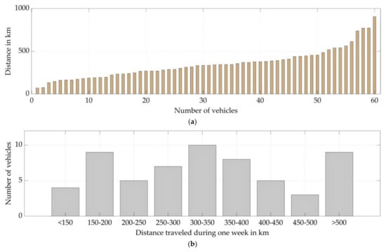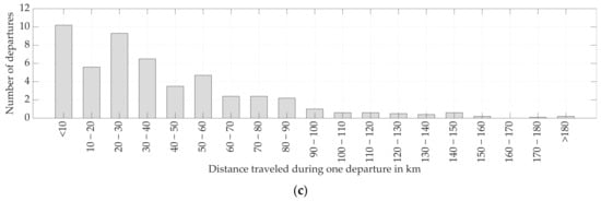 As a result of the analyses, additional parameters describing the group of vehicles tested were determined. The corresponding Figure 8a determine the entire distance traveled by each vehicle during the one week considered. Based on the input data, histograms were also created representing the distance most frequently driven by the selected fleet for the entire week (Figure 8b) and during single trips (Figure 8c). The distance most frequently traveled by vehicles during the whole week was between 300 and 350 km but, due to the nature of their use, single trips did not exceed 100 km and usually ranged between 0 and 10 km (Figure 8c).