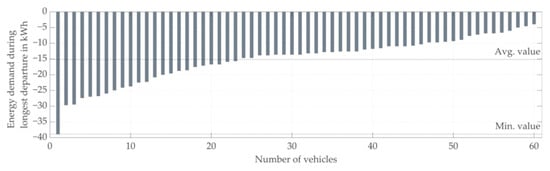 Additionally, based on the values of electricity consumption assumed and trips made during the day, the minimum battery capacity were determined. The statistics shown in Figure 9 allow to determine the type of vehicle fleet analyzed to be determined in terms of the battery capacity required, i.e., the type of vehicles used (light or heavy vehicle). The figure shows that the maximum battery capacity required does not exceed 20 kWh for 50% of the vehicles analyzed. Moreover, the capacity level required for 60 vehicles was below 40 kWh, which increasingly often corresponds to the lower limit of the capacity of EVs manufactured today [].