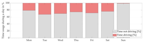 Furthermore, the vehicle’s parking time was determined based on the data available and the time of vehicle’s utilization. The results obtained according to Equation (4) are shown in Figure 10 as a percentage share for the whole day.
