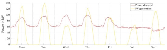 Energy demand of the commercial load for one week’s operation and PV generation.