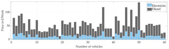 Based on the developed driving profiles, for each vehicle, a comparison was made between the purchase cost of the electricity per week for an electric vehicle, and the corresponding purchase cost of the diesel for a combustion vehicle. For the fleet analyzed, the cost of diesel is approximately 2.8 times more than electricity. The total purchase cost of diesel for the fleet is 2381.72 Euros per week while for the electric vehicle fleet the cost is 861.40 Euros per week. The unit prices of fuels were adopted on the basis of statistical data according to [,]. The results are shown in Figure 13.