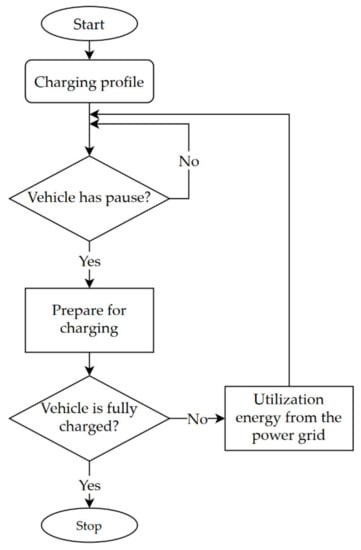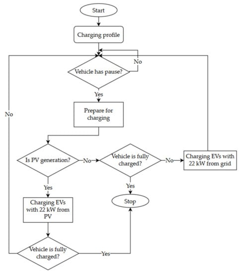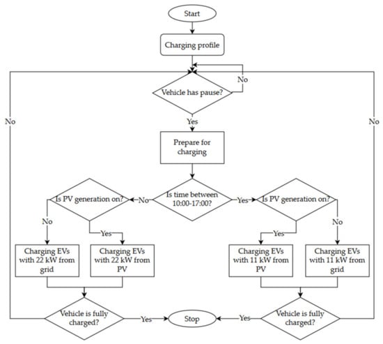 In the next model, an additional energy source was used to cover the local energy demand of the vehicle fleet. The power distribution was performed according to the algorithm in Figure 16. Equation (5) was modified with an additional PPV resulting from the generation of energy from the PV modules. The change is presented in Equation (7). The amount of energy was calculated according to the Equation (6).