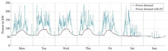 In this case, a significant increase in the power demand can be observed in a given week in which EVs were connected to the grid. This increase was, in some cases, even double the maximum peak demand. The charging of EVs was also dynamic; thus, there were very high instantaneous power spikes on the grid. The energy consumption of the company and the charging process is shown in Table 3.