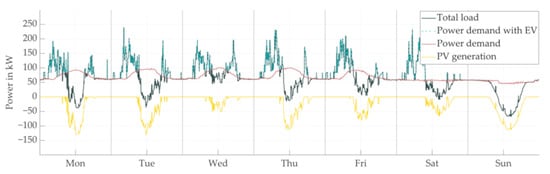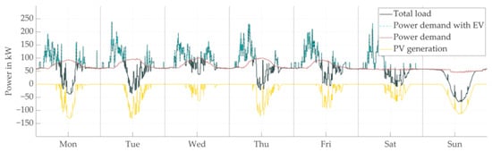 The daily variations of the load and the demand for power and energy in the time interval considered were taken into account during the evaluation of the use of EVs in the operation of the company. Metering data was used in the simulation for an intermediate enterprise for which the average demand per week is shown in Figure 12. The maximum instantaneous power demand of the company is 100 kW. When controlling the additional load resulting from the charging of EVs, the energy generation from the photovoltaic farm, whose maximum instantaneous power was 140 kW and produced ca. 5.31 MWh, was considered. The waveform of energy production is shown in Figure 12. Three scenarios/cases were created for the assumed load and PV generation in which the additional load is shaped and balanced.