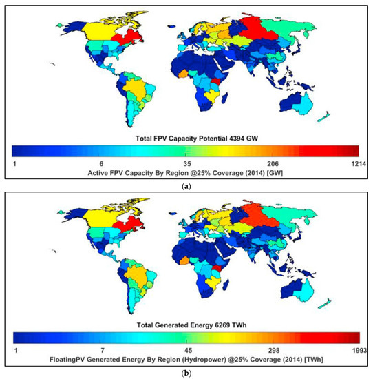 The evolution of FPV has, in the recent past, included the hydropower industry, owing to the opportunity for retrofitting or installing FPV panels on the abundant water surface area of hydro dams [6,15]. To put this into perspective, hydropower represents a vital aspect of the renewable energy system and covered approximately 16.4 percent of the global electricity generation at the end of 2017, which is equivalent to 1.27 TW and 4.185 TWh of total installed capacity and generated energy, respectively, owing to the increased technological investment in the equatorial regions and China. However, the negative impact of climate change (i.e., noticeable droughts) over the past decade in some regions of the world has necessitated the rapid penetration of solar photovoltaics and wind technologies [11]. The global FPV potential for waterbodies was mapped by research with hydropower capabilities, which included electricity generation and installation capacity in terawatt-hours and gigawatts, respectively. Figure 1 below outlines the total world energy distribution in “GW” at the top and “TWh” at the bottom [16].
