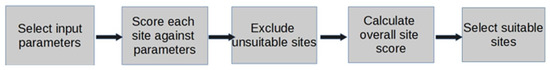 The decision-making process regarding the suitability and location of sites for variable renewable energy sources (solar PV and wind) utilizes geospatial parameters, mainly involving GIS models in dynamic analysis (i.e., to capture, analyze, store, manage, and manipulate spatial or geographical data) [70,71,72,73]. To aid in formulating a ranking and geospatial data interpretation methodology, such GIS modeling is usually paired with multi-criteria decision-making (MCDM) [73]. Moreover, in the late 1990s, literature in the development of VRES models started gaining traction [74,75]. Global interest in the optimal siting of solar PV and wind in the recent past has arisen, due to the quest of attaining carbon neutrality, leading to the development of generic models based on the process shown in Figure 2. Firstly, the input parameter selection, ranging from social-economical, technical, and environmental factors, is completed [76]. For example, ideal wind site considerations typically include the proximity to the existing electrical network (i.e., for easy grid connection), proximity to a good road network, positioning further away from protected zones (i.e., national parks or heritage land), or further away from settlements to prevent noise and flicker, good resource potential (i.e., average wind speeds and capacity factor above sea level), and being further away from the flight path to prevent interference with radar equipment near airports. Unsuitable sites are then excluded from further analysis by scoring against the model input parameters (i.e., sites with low resource potential).