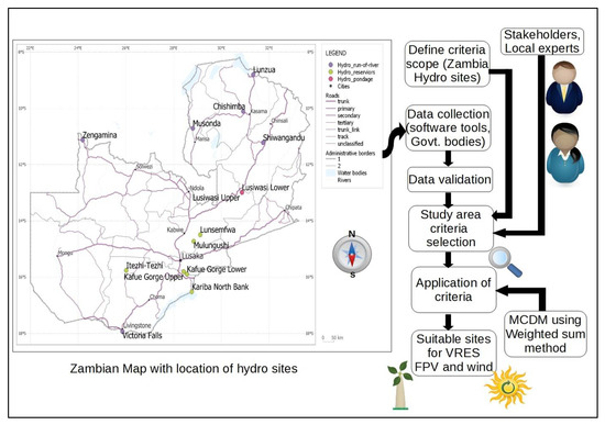 The proposed study methodology for assessing site suitability was confirmed after stakeholder engagements (i.e., local experts, power utility) and extensive reviews from the literature [77,78,79,80]. The sites of interest included 5 reservoir-type, 2 pondage-type and 7 run-of-river (RoR)-type hydro plants, as shown in Table 2.
