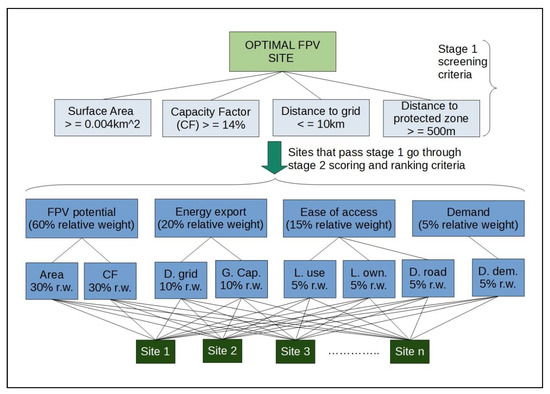 A two-stage approach was utilized in the selection of FPV sites, namely, screening and filtering (stage 1), and ranking and scoring (stage 2), as shown in Figure 4. The filtering stage looked at the capacity factor, distance to the grid, water surface area and distance to protected zones as the model input parameters [81,82,83]. The scoring and ranking stage included the relative weight (r.w.) distribution of the energy export (20% r.w.), ease of access (15% total r.w.), demand (5% total r.w.) and floating PV potential (60% total r.w.) [84,85,86,87].