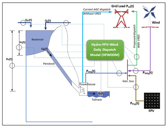 The proposed energy system at Kafue Gorge Upper will comprise hydro, onshore wind, floating photovoltaics and grid load, as given in the schematic in Figure 5. The schematic shows the existing automatic generation control (AGC), excluding VRES, and the proposed Hydro-FPV-Wind daily dispatch (HFWDD) strategy. The model assumes that all the three sources of generation under consideration are coupled to the same generation bus. Moreover, the model receives inputs from the reservoir height variation “Hr(t)”, reservoir inflow “Qin(t)”, hydro generation schedule “PHYg(t)”, water usage/consumption “QT(t)”, the hydro virtual battery from saved water “Qs(t)”, grid load “PLD(t)”, penstock flowrate “Qp(t)”, onshore wind output “PWDg(t)” and floating photovoltaic output “PPVg(t)”.