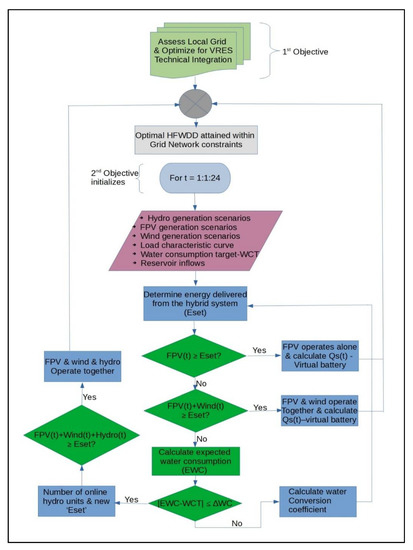 The objective of the HFWDD model is to balance the seasonal load characteristic curve on the grid by optimally dispatching the three generation sources (i.e., hydro, FPV and wind). This entails developing a two-stage model that addresses the technical parameters of the electrical network for any additional generation and, thereafter, optimizes the energy system using a customized dispatch algorithm (Figure 6). Firstly, the extent of wind and FPV integration on the grid that would negatively impact the network parameters (i.e., power losses, voltage magnitude and stability) is assessed in the two-stage model. This is in line with previous research [33,42,108,109,110,111,112,113,114]. Secondly, seasonal hourly reservoir inflows, water consumption targets, grid demand characteristics and the total generation scenarios (wind, FPV and hydro) are incorporated into the model. Subsequently, the grid load is served by prioritizing the integration of VRES [115] as readily available, followed by a downward regulation of hydro-generation at any moment. This throttling down of hydropower is equivalent to the water-saving potential (virtual hydro battery). Nevertheless, limited reservoir capacity, coupled with a reduction in the grid demand, could present storage challenges in a wet year (which is “rarely experienced”), hence necessitating the opening of the floodgates to get rid of excess water. Similar optimization and dispatch studies of RES were conducted by [111,116,117,118,119,120,121,122,123,124,125,126].