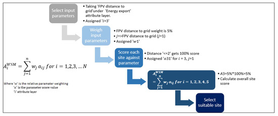 The sites that have the potential for further development and pass the filtering stage are then scored and ranking using the weighted sum method (WSM) to assess their suitability (WSM is given in the equation below) [71,73]: