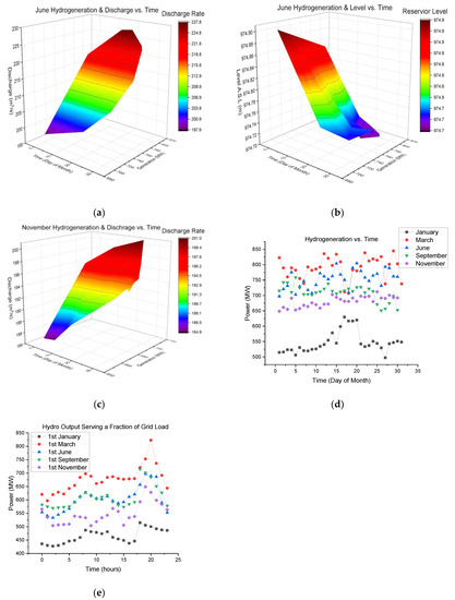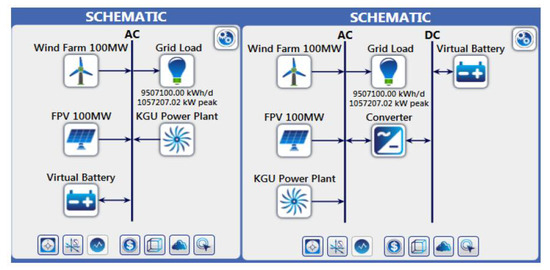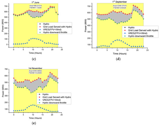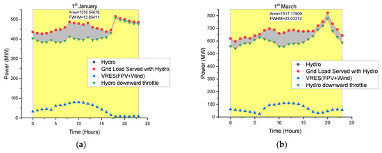 Virtual storage, as indicated in Figure 5 and Figure 6, was modeled in HomerPro in Section 4.2.4. This looks at the availability of variable renewable energy sources (FPV and wind). Based on this factor, the model calculates how much hydro would have to be ramped down. The ramping down of hydro means that less water is utilized that is then available later (i.e., at night when the sun is not shining, and also at times when the wind is calm)—the dark/calm periods will require the saved water to be utilized.