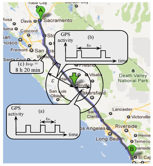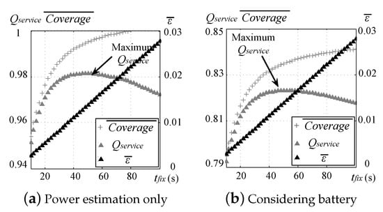 where and are the service time and the given trip time, respectively. We calculate the energy used when the GPS application is running from Equations (A4) and (A5). We denote the power consumption of the other devices as . The used energy is estimated as: