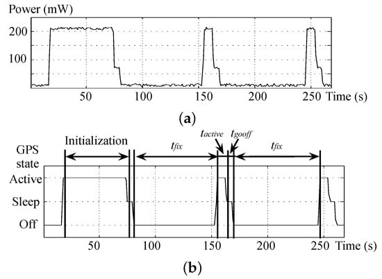 The GPS consumes a different amount of power depending on its state. (a) GPS power consumption has a typical pattern based on its state. (b) GPS state analysis. After initialization, it consumes meagre power when it enters the OFF state.