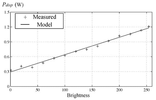 However, the LCD consumes power linearly proportional to brightness because the relationship between physical light intensity and human-perceived brightness is nonlinear. Thus, the brightness value of the image data is tuned by a gamma table. The power consumption becomes proportional to the brightness after the gamma tuning is applied, as shown in Figure 4. This figure shows the measured power consumption and the plot produced by the model when we change the brightness parameter in the Android OS.