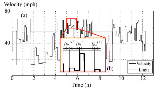 In practice, the velocity of a vehicle changes over time. Figure 5a shows the speed limit along the route from San Diego to Sacramento. Different speed limits are applied in residential areas urban freeways, and rural freeways. We assume that the velocity changes randomly within the speed limit. We model the trip in a discrete manner using intervals. The next fixing time interval, , is determined at each fixing time, as shown in Figure 5b.