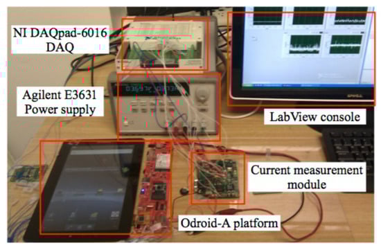We set up an environment to extract the coefficients for the system power consumption model with Hardkernel’s [21] Odroid-A platform. We measured the current of the Odroid-A platform using shunt resistors and Texas Instrument’s INA194 [22] current sense amplifier. We collected the measured current data with National Instrument’s [23] DAQPad-6016 and LabView. Agilent’s E3631 [24] provided the power of the Odroid-A platform and the current measurement module. We double-checked the measurement data using a digital multimeter. Figure 6 shows the experiment setup. We present the battery and target system power model in Appendix A and Appendix B. All the coefficients extracted from the experiments are listed in Table A3.