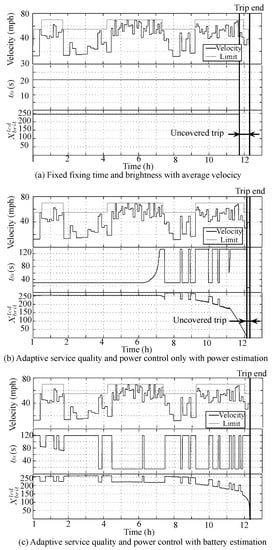Behavior of (, ) for (a) fixed values with average velocity, (b) service quality control only with power estimation, and (c) with battery estimation.