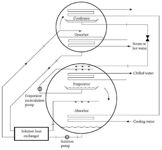 Schematic diagram of a single-effect water/lithium bromide absorption chiller. Adapted from [45].
