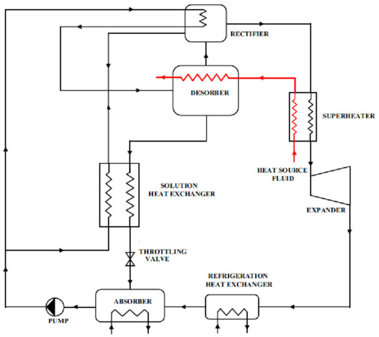 - Jawahar, C.P.; Saravanan, R.; Bruno, J.C.; Coronas, A. Simulation studies on gax based Kalina cycle for both power and cooling applications. Appl. Therm. Eng. 2013, 50, 1522–1529. [Google Scholar] [CrossRef]