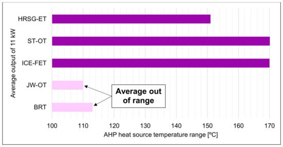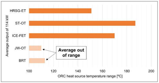 In order to evaluate the potential of a given heat source feed a small–medium CHP plant, this paper adopts the following methodology, divided into two steps. First, it is necessary to define a parameter that is used to evaluate a specific waste heat. For this work, it is temperature level. Second, gather the data of the feeding temperature level of the CHP technologies, presented in Section 2, with their respective output values. Therefore, Table 5 presents the waste heat sources selected in Section 3.5 with their respective parameters for evaluation. These parameters are not provided by the LUT model. It is defined, selected, and reviewed by this work.