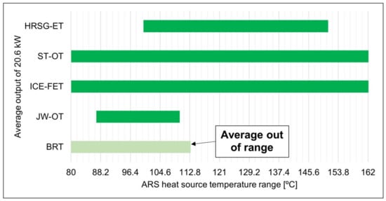 Heat source temperature and its respective output values for the reviewed CHP technologies: ORC, ARS, AHP, and APC.