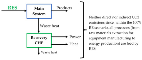 Another important energy source for feeding CHP systems is waste heat. Its use is one of the main ways of increasing efficiency and decreasing costs of energy systems, with a cheap, clean, and fuel-free energy source that can be considered renewable [31]. Generally, waste heat is a by-product from fuel combustion processes or chemical reactions, which are otherwise released into the environment [32]. The US Department of Energy indicated that the heat energy wasted by the US industry had the potential to produce about 20% of total US electrical output energy [33] and hence to reduce substantially GHG emissions. Therefore, going back to the 100% RE scenario, a question arises: what could be the role of CHP technologies in such a scenario when it comes to WHR? The main objective of this paper is to address this question by reviewing the literature on the specific 100% RE scenario pictured by researchers from the Lappeenranta University of Technology through the so-called “LUT model”, evaluating possible small–medium CHP technologies suitable to recover low–medium temperature waste heat sources, and developing an economic analysis to evaluate the potential annual savings each CHP technology is able to provide. The search is not exclusively limited to CHP systems: if adequate to a given situation, CCHP and Combined Cooling and Power (CCP) systems might also be considered.