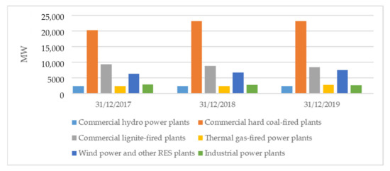 Figure 1 presents the structure of PPS’s installed capacity in 2017–2019. In the last 3 years, there was a small increase in RES, which in 2019 accounted for approx. 16% of the entire capacity installed in the PPS. In total, approx. 47 GW of the capacity was installed in the PPS at the end of 2019 [12].