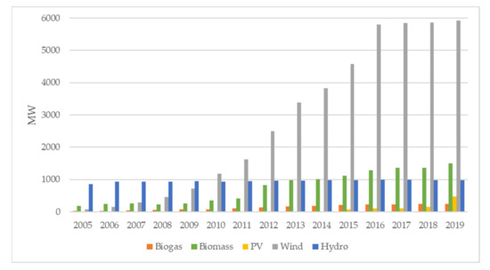 Renewable energy capacity installed in Poland in 2005–2019 [MW]. Source: developed by the authors, based on Reference [15].