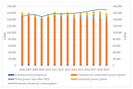 Domestic electricity production and consumption in Poland in 2006–2019 [GWh]. Source: developed by the authors, based on Reference [15].