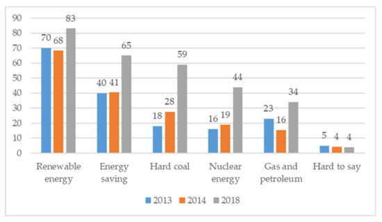 The results indicate massive public support for the growth of renewable energy production, a strong policy supporting renewable energy, increasing energy efficiency, and greater active involvement of the Polish government in the efforts to reduce emissions in order to avoid dangerous changes. At the same time, support for coal, nuclear power, and other fossil fuels is much lower (Figure 6).