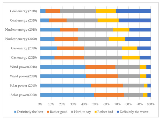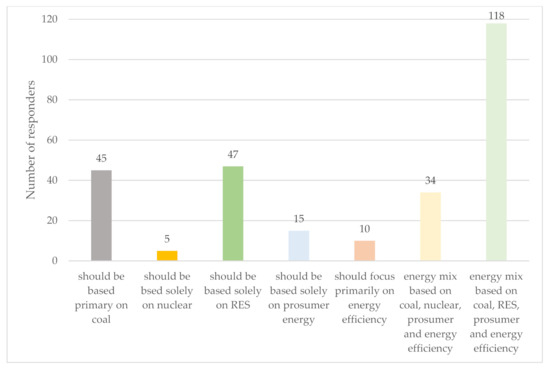 The analysis of secondary data shows that the support for the European climate and energy policy among Poles is on the rise, as is the support for clean power such as solar and wind energy. There has been a slight decrease in the support for nuclear power, which may be due to the lack of a clear and consistent action plan and results. Social expectations are in line with the shape of the updated energy policy. As shown in [32,33,34], renewable energy sources, mainly wind and photovoltaics, are seen as the best ways of generating energy. Additionally, our own research showed that the optimal energy mix for Poland is expected to be based on RES or on RES together with prosumer initiatives and energy efficiency actions. This corresponds with the new goals of the energy policy in Poland, assuming no more than 56% of coal in power generation in 2030, at least 23% of RES in gross final energy consumption in 2030 a 30% reduction in GHG emissions by 2030 (compared to 1990).