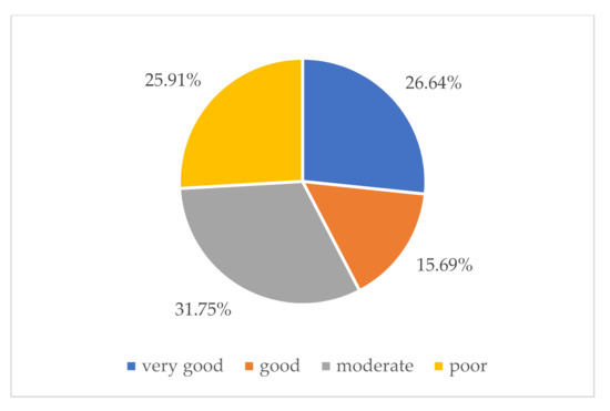 Respondents were asked about their awareness of the Energy Policy of Poland until 2030. A total of 230 respondents said ‘yes’ (83.21%, of which 58.26% were residents from urban municipalities, 22.17% were from cities with country rights, 16.09% were from urban and rural municipalities, and 3.48% were from rural municipalities), while 44 responded said ‘no’ (16.06%, of which 20.45% were residents from urban municipalities, 20.45% were from cities with country rights, 25.00% were from urban and rural municipalities, and 34.09% were from rural municipalities). For the question for their knowledge of the EU climate and energy policy assumptions, 73 (26.64%) of respondents assessed their knowledge as very good, 43 (15.69%) as good, 87 (31.75%) as moderate, and 71 (25.91%) as poor (see Table 2 and Figure 9).